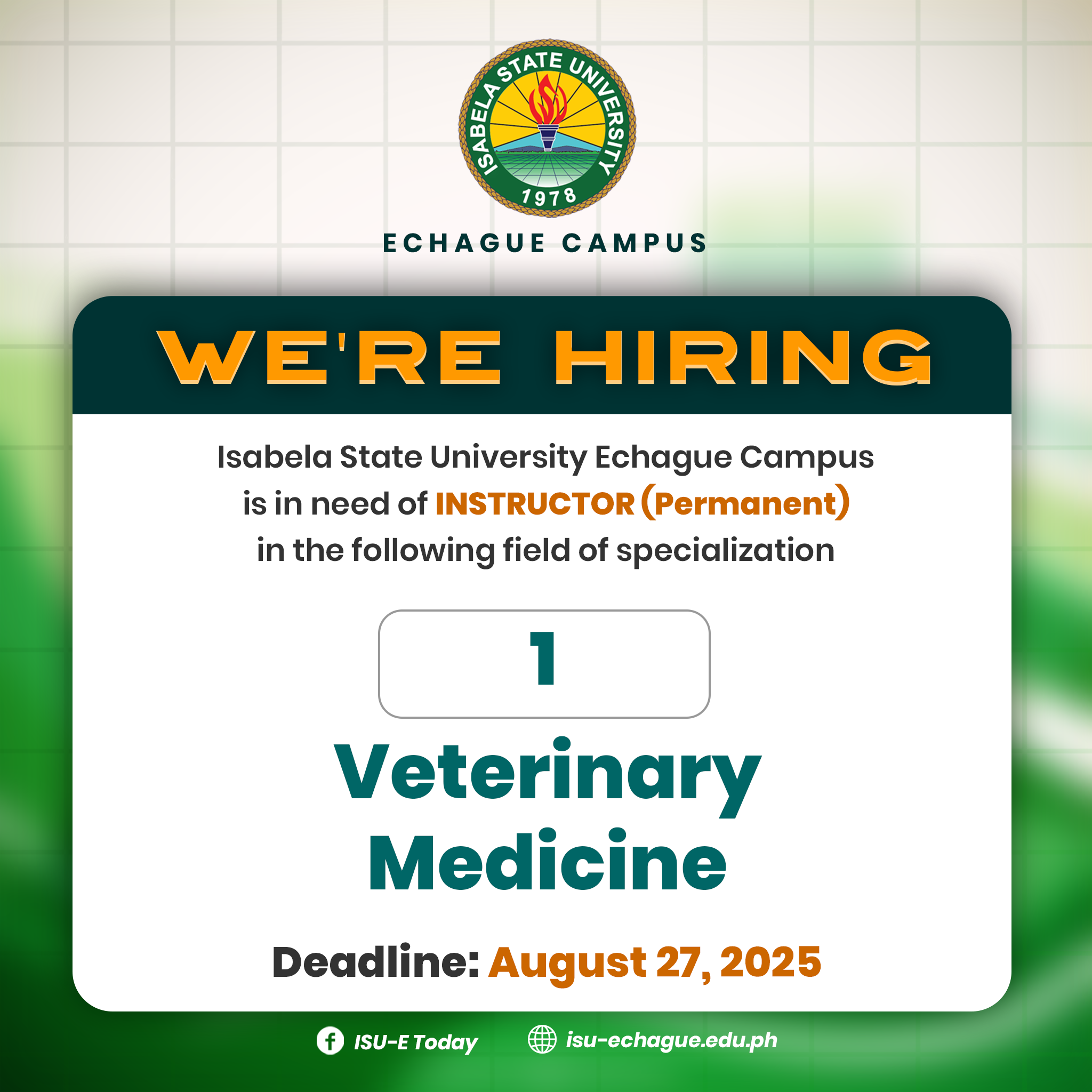 Isabela State University Echague Campus is in need of INSTRUCTORS (Permanent Position) 1 – Veterinary Medicine ———————————————————— 𝙌𝙪𝙖𝙡𝙞𝙛𝙞𝙘𝙖𝙩𝙞𝙤𝙣 𝙎𝙩𝙖𝙣𝙙𝙖𝙧𝙙𝙨 : Education: Preferably Master’s Degree in the Area of Specialization Experience: Preferably with teaching experience in Tertiary Education Training: None Required Eligibility: RA 1080 ———————————————————— 𝘿𝙤𝙘𝙪𝙢𝙚𝙣𝙩𝙨 𝙉𝙚𝙚𝙙𝙚𝙙 : 1. Application Letter 2. Personal Data Sheet (PDS) continue reading : 𝗪𝗘’𝗥𝗘 𝗛𝗜𝗥𝗜𝗡𝗚 | Veterinary Medicine Instructor