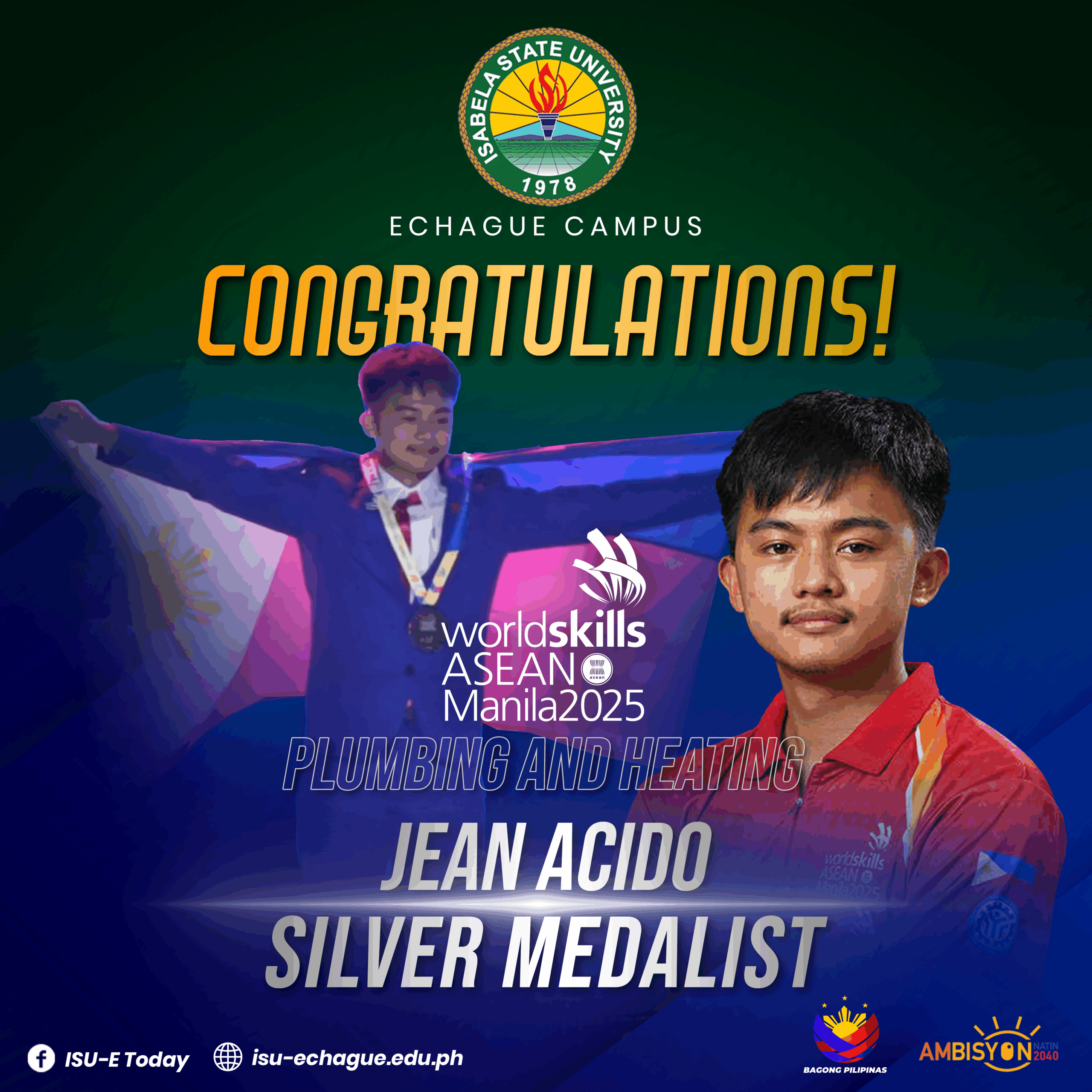 Mr. Jean Acido, a Bachelor of Technology and Livelihood Education (BTLEd) student from Isabela State University (ISU) Echague – College of Education, has won a silver medal in Plumbing and Heating at the 14th WorldSkills ASEAN 2025 Competition! Held at the SMX Convention Center in Pasay City from August 25-30, 2025, this year’s competition, themed continue reading : KUDOS! | ISU Echague Celebrates BTLEd Student’s Victory at WorldSkills ASEAN 2025!