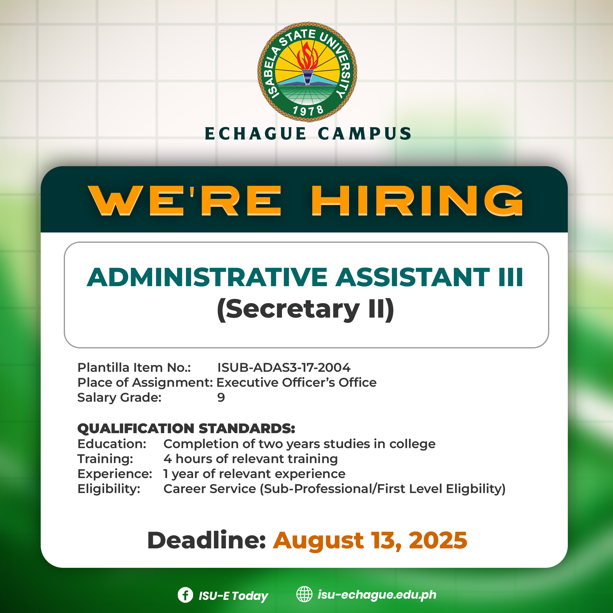 Isabela State University Echague Campus is in need of ADMINISTRATIVE ASSISTANT III (Secretary II) Plantilla Item No.: ISUB-ADAS3-17-2004 Place of Assignment: Executive Officerβs Office Salary Grade: 9 ————————————————————- QUALIFICATION STANDARDS: Education: Completion of two years studies in college Training: 4 hours of relevant training Experience: 1 year of relevant experience Eligibility: Career Service (Sub-Professional/First Level continue reading : πͺπ’π₯π πππ₯ππ‘π