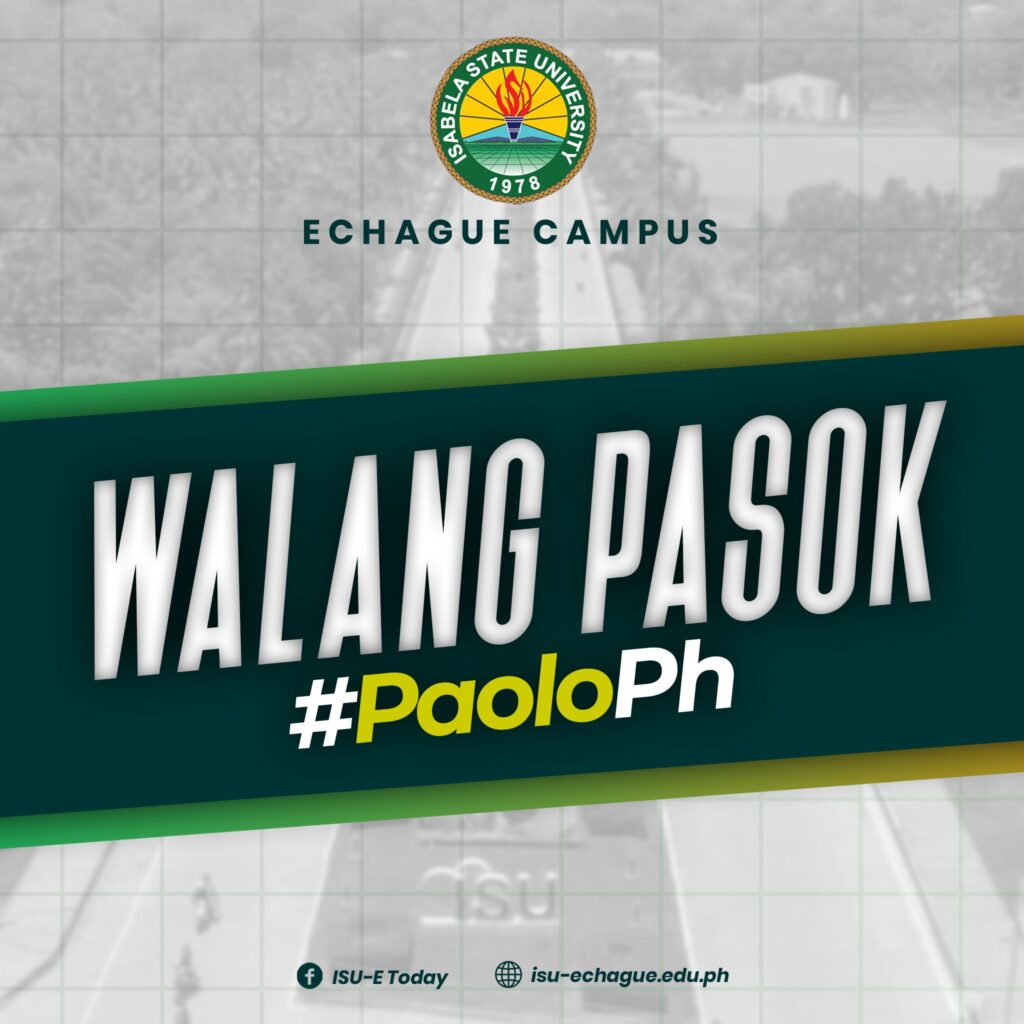 Suspendido ang klase sa mga pampubliko at pribadong paaralan sa lahat ng antas, at sa lahat ng opisina at ahensya ng gobyerno bukas, Oktubre 3, 2025, dahil sa Bagyong #PaoloPH. Ito ay ayon sa inilabas na impormasyon ng Bayan ng Echague.